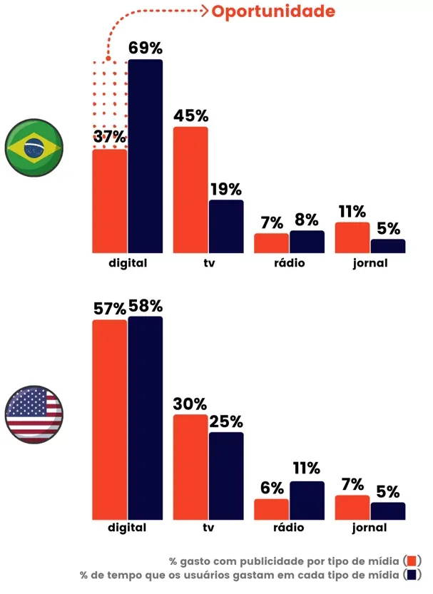 De acordo com o gráfico, enquanto nos EUA os investimentos em marketing digital já chegam na casa dos 57% dos valores gastos em publicidade, no Brasil esse percentual chega apenas a 37%.